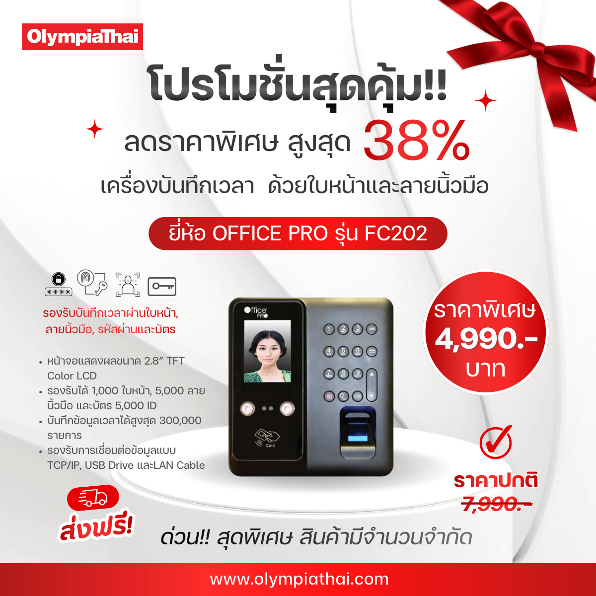 7 ม.ค. โปรโมชั่นสุดคุ้ม! เครื่องบันทึกเวลาสแกนหน้า–ลายนิ้วมือ Office Pro รุ่น FC202 ลดสูงสุด 38% ส่งฟรี!! Fc202, Office PRO, promotion, ส่งฟรี, เครื่องคิดเลขโอลิมเปีย, เครื่องบันทึกเวลา, เครื่องสแกนนิ้วราคาถูก, โอลิมเปียไทย